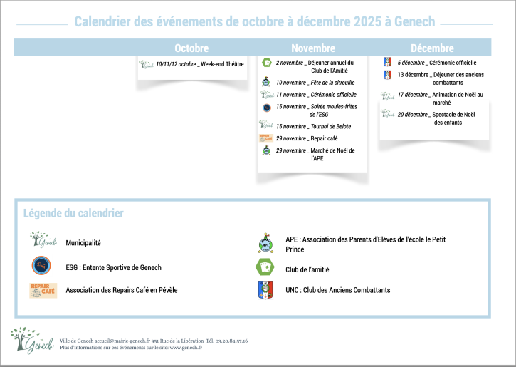 "C'est avec plaisir que nous vous présentons le calendrier des événements 2025 qui auront lieu à Genech. Il est conjoint aux associations et à la municipalité, un pictogramme vous indique à chaque fois l'organisateur concerné.