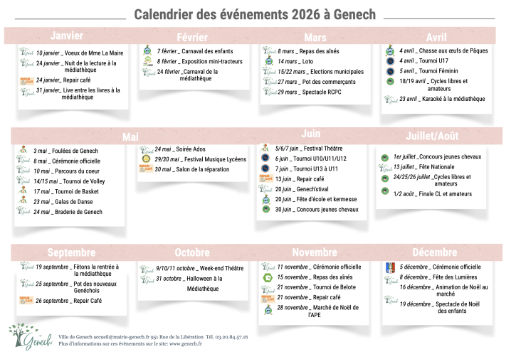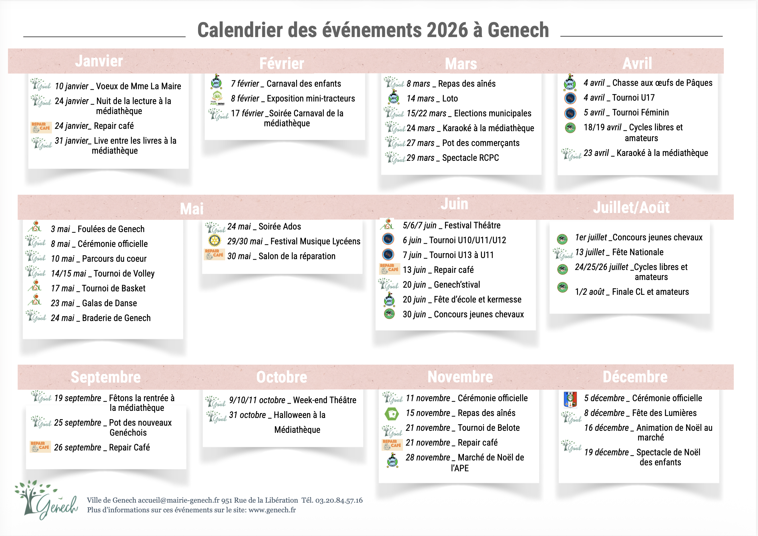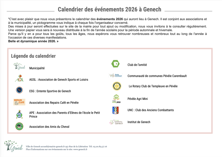 "C'est avec plaisir que nous vous présentons le calendrier des événements 2026 qui auront lieu à Genech. Il est conjoint aux associations et à la municipalité, un pictogramme vous indique à chaque fois l'organisateur concerné.